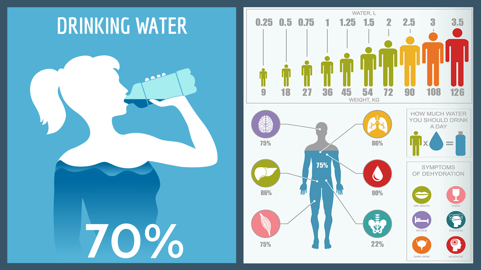 Corpul uman, în mediu, este format din 70% din apă, astfel că respectarea unui regim de apă este esențială pentru funcționarea organismului uman. Conform Organizației Mondiale a Sănătății, cantitatea zilnică necesară de apă pentru o persoană este de 30 ml la 1 kg greutate. Adică, o persoană de 70 de kg are nevoie de 2 litri și 100 ml de apă pe zi. [6]